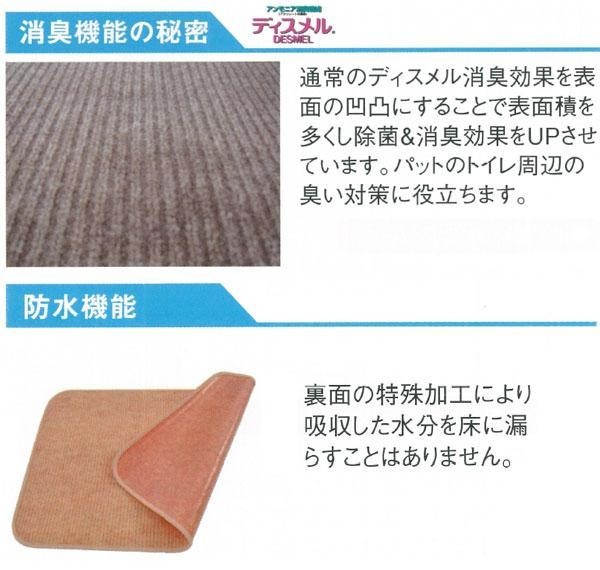 除菌力と安全性、耐久性に優れた除菌繊維である「銀世界」と、ペット臭やトイレなどのアンモニア臭を吸着し消臭する繊維である「ディスメル」を使用したマットです。裏面の特殊加工により、吸収した水分を床に漏らすことがありません。吸収・消臭効果は天日干しや洗濯によって回復、いつでも清潔な状態でお使いいただけます。 |