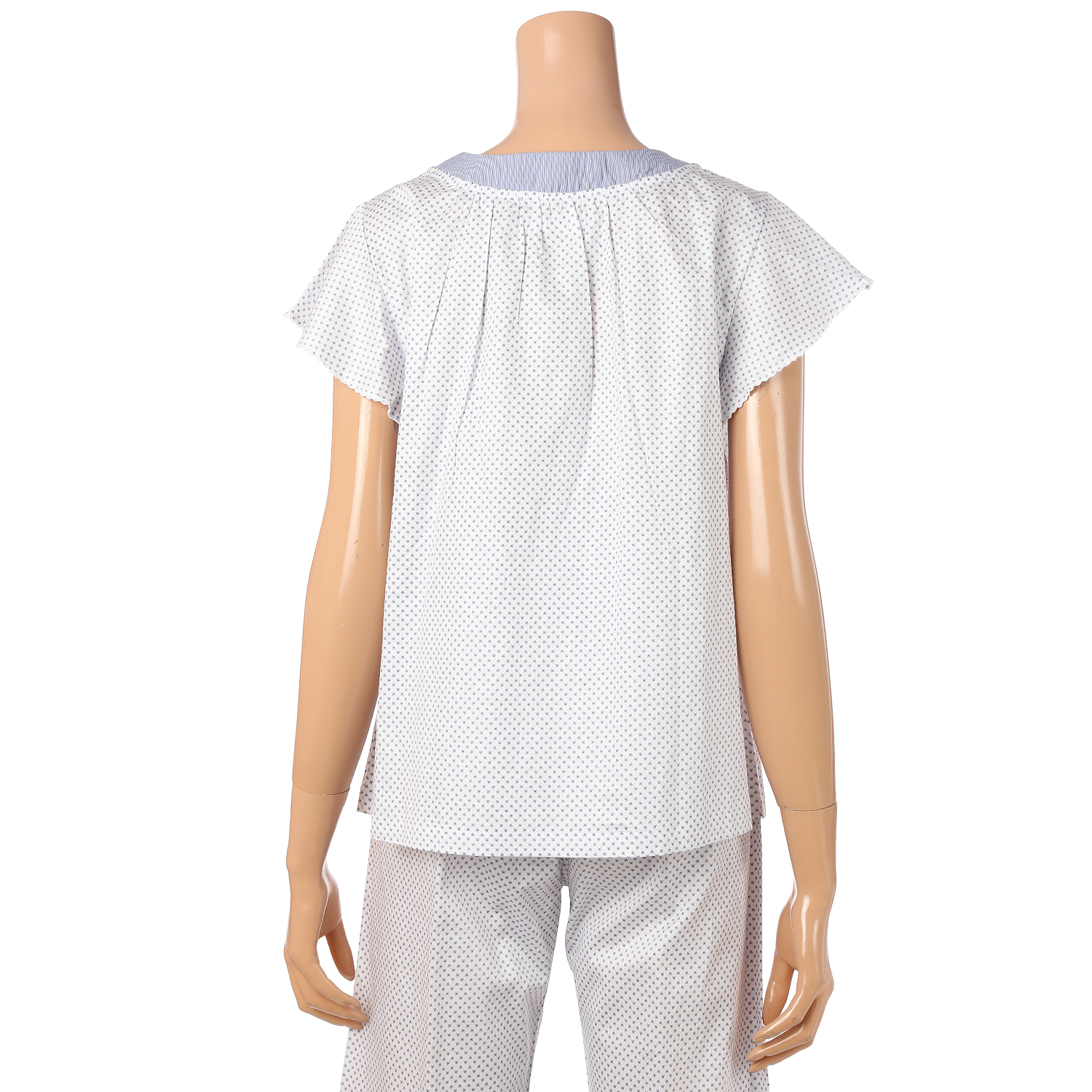 아이보리 컬러에 잔잔한 올오버 기하학 프린트와 블루컬러 스트라이프 배색이 포인트이며