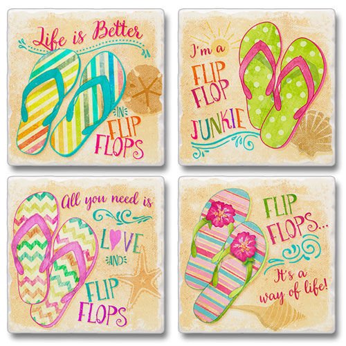 -. Brand : Highland Graphics -. EAN : 0608814992957 -. Feature : Assorted 4-coaster set - a different image/design on each one. / Each tumbled stone coaster is an approximate 4" x 4" square x 0.5" thick. / Tumbled edge adds elegance and charm. / Coasters are cork backed to protect your furniture / Cleans easily with mild liquid detergent and water. -. MPN : 14139899 -. PartNumber : 14139899 -. ProductGroup : Kitchen -. ProductTypeName : KITCHEN -. Title : Flip Flop Junkie - Square Tumbled Stone Coasters -. UPC : 608814992957