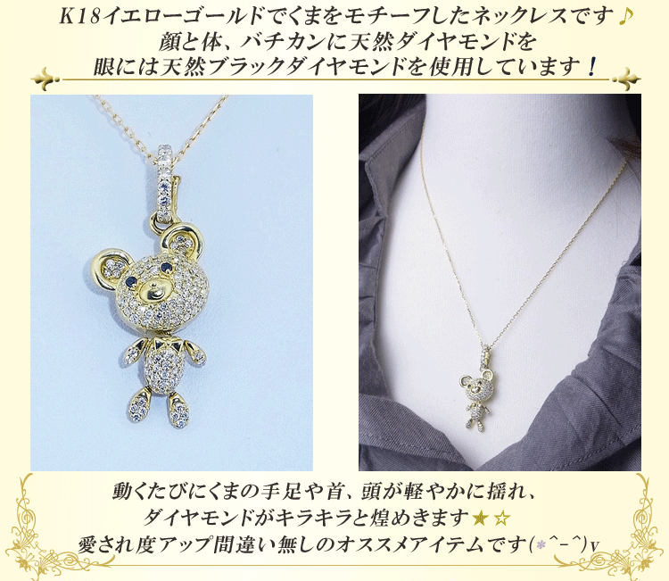 商品説明 K18イエローゴールドでくまをモチーフしたネックレスです。顔と体、バチカンに天然ダイヤモンドを眼には天然ブラックダイヤモンドを使用しています。