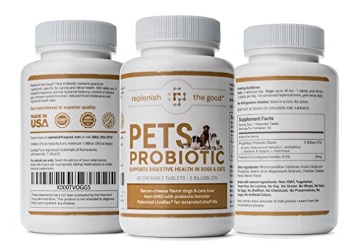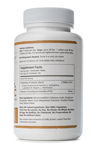 - Title : Pet Probiotic for Dogs & Cats, 60-Day Supply. 3 Billion CFU, 6 Strains. Bacon Cheddar Flavored Chewable Tablets Boost Digestive and Immune Health. Reduce Upset Stomach, Diarrhea & Constipation