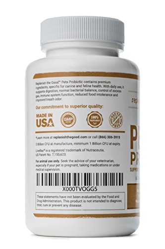 - Feature : IMPROVES DIGESTIVE & INTESTINAL HEALTH - Helps support a healthy digestive system in cats and dogs. Our Pets probiotic replenishes the good bacteria in the gut to support stomach issues including diarrhea, gas, constipation, abdominal discomfort. / PET FRIENDLY STRAINS WITH PREBIOTIC BOOSTER. Our Pet formula has an optimal balance of each of the following strains: Bifidobacterium lactis, Enterococcus faecium, Lactobacillus acidophilus, Lactobacillus plantarum, Bifidobacterium longum, Lactobacillus rhamnosus. It also has a prebiotic booster (FOS) which serves as food for the probiotics. / SUPERIOR TASTE - With bacon and cheese flavor, your cat or dog will be begging for more. Your pet probiotic won't do any good if you can't get them to eat it, which is a challenge with many tasteless probiotics on the market. / SUPERIOR SHELF LIFE. Probiotics are only beneficial if they survive. Our Pet formula has LiveBac Patented Processing, which extends shelf life to 18 months without refrigeration. / 100% MONEY BACK GUARANTEE! - If you are not completely satisfied with our Pet Probiotic then just ask us for a refund and you'll be taken care of. No questions asked!
