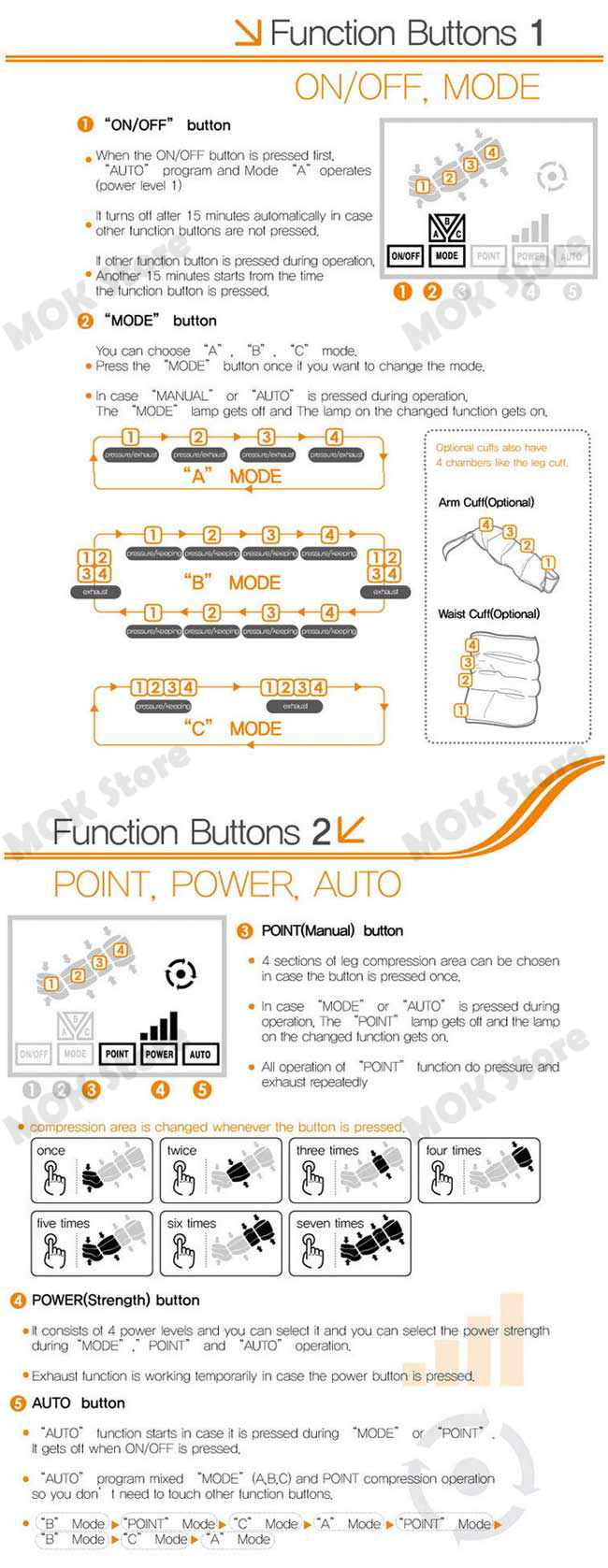 - Package Contents : Main Body / Air boots for legs / Air hose set / 2 Foot acupressure plate