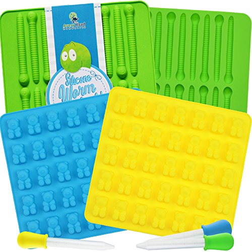 GUMMY BEAR MOLD Silicone & WORM Molds PARTY PACK - 3 BONUS Droppers + RECIPE PDF Non - BPA Premium Big Gummie Bears & Worms Candy Molding ~ Easy Soap, Ice Cube, Chocolate and Gelatin Trays