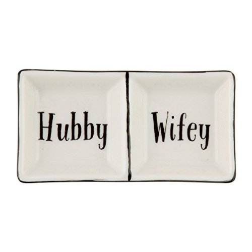 -. Feature : White ceramic material with a black lining around the edging. / Two sections within the dish, one features the sentiment "Hubby" and the other features the sentiment "Wifey" / Written in beautiful typography against a stylish and crisp white background. / Great gift for the newlyweds to put their rings in a safe spot. / Dimensions - 6 x 11.5 x 1.7 cm