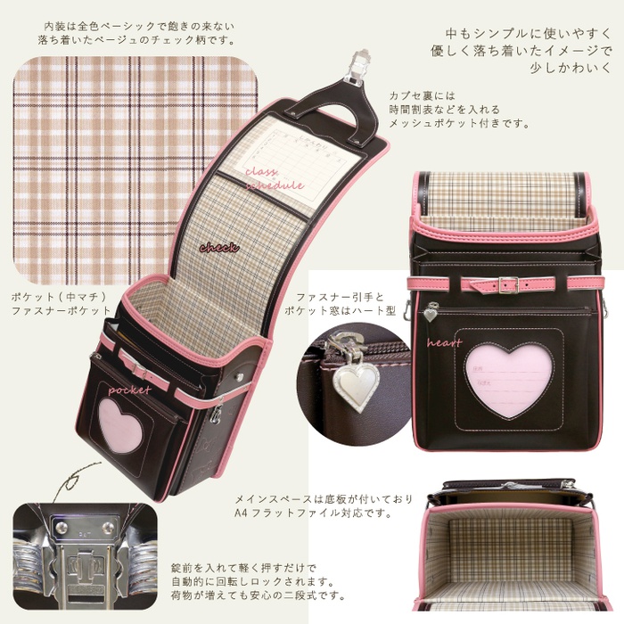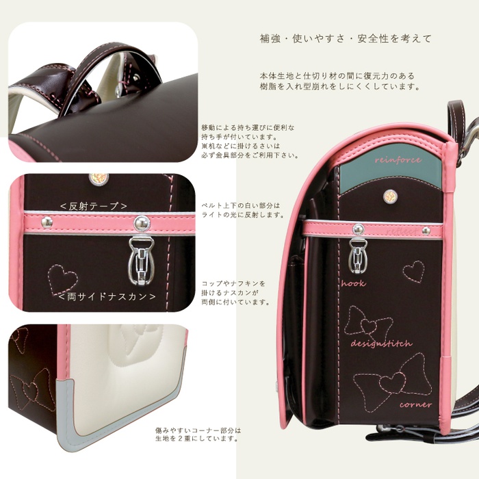 ◆수량 한정 모델이므로,서둘러 검토 하십시오.세일즈 포인트■A4플랫 파일 대응 사이즈에 양측면으로 배면에 귀여운 리본 하트형의 스텟치와 멋진 콤비 배색 사용으로 했다, 디자인 캐주얼 란도세루(초등학생이 어깨에 매는 가방)가 신 등장!!내부도 하트형의 창이나 패스너 문고리에 큐트♪♪