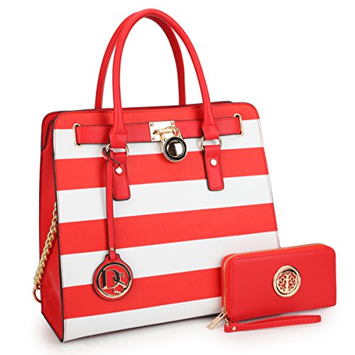 -. Brand : MKY -. Department : womens -. Feature : Top Zipper Closure/Flat Bottom with Gold Tone Studs/Rolled and Stitched Handles/Chain Shoulder Strap Not Detachable / Our goal is to ensure that you're 100% satisfied with your purchase right out of the box. If you're not satisfied for whatever reason, we will gladly accept your return provided that you request authorization within 30 business days of the delivery date. -. Model : MKY-XL-02-2553 -. ProductGroup : Shoes -. ProductTypeName : HANDBAG -. Title : MKY Padlock Stripe Satchel Handbag Designer Purse Wallet Set w/ Chain Shoulder Strap