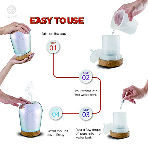 16 Color changing mood lighs: SUN-E Ultrasonic Aromatherapy Oil Diffuser is a well designed with 3D 16 Color Changing LED lights, easy to operate and portable, so you can take it anywhere you want. Even on vacation.