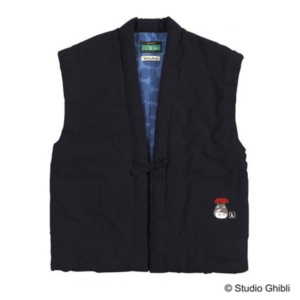 ポケット部分にトトロの刺繍が施された、あたたかいチョッキ型のはんてんです。裏地のかわいいプリントもポイント♪