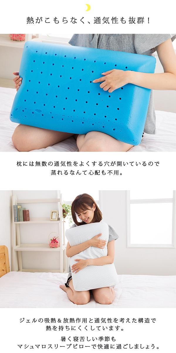 | マシュマロのように柔らかく、首と頭をしっかりと支えます。まるで包みこまれるような優しい使い心地です。寝苦しい夜を快適に過ごせるように、ジェルの吸熱&放熱作用と通気性を考えた構造で熱を持ちにくくしています。 |