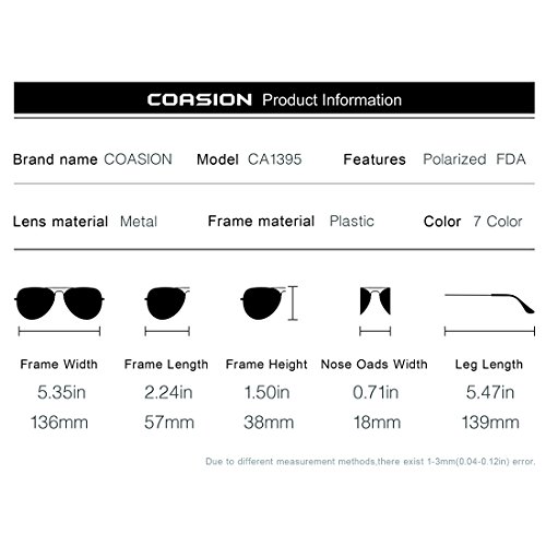 FEATURES ABOUT CA1395 The sunglasses are specially designed for men. We offer different color metal frames which are equipped with polarized lenses with various color options. Polarized lenses provide you with improved clarity and keep your eyes from harmful UVA and UVB rays.