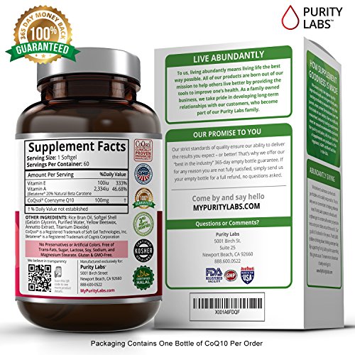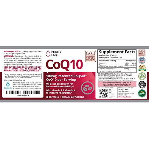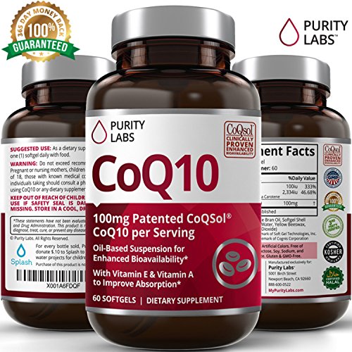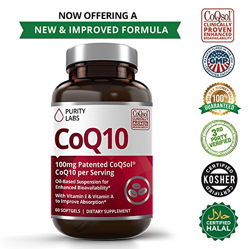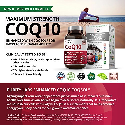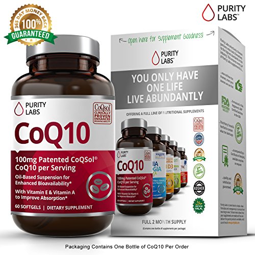 Coenzyme Q10 is naturally found in human cells and is integral to healthy functioning of the heart, brain, and skin as we age. A CoQ10 supplement can help rejuvenate key body systems and provide the energy boost needed to perform at your best every day. Clinically Proven to Have Superior Absorption Over Other CoQ10 Supplements Due to its large molecular size and high variability, CoQ10 is not easily absorbed in the human body. When delivered in a powdered crystalline form, as with most CoQ10 supplements, less than 1% of orally administered CoQ10 permeates the GI tract to reach the bloodstream. Patented CoQSol® is meticulously formulated to overcome the challenges responsible for poor absorption, resulting in clinically proven 2.6x higher amounts of CoQ10 absorption. Instead of crystalline powder, which does not entirely dissolve in the lipid portion of the small intestine, CoQSol® CoQ10 is suspended in rice bran oil, which naturally contains gamma oryznol, a plant sterol with lipid-like solubility which facilitates aborption.* CoQSol® CoQ10 is formulated with Tocophorols (a form of Vitamin E) and Carotenoids (a form of Vitamin A) which both act to block the recrystallization of CoQ10 to further support absorption. Purity Labs has formulated one of the cleanest purest CoQ10's on the market to date. We source our ingredeints from only the BEST Suppliers in the world. All of our supplements are 3rd Party Tested and lab certified to meet or exceed label claims....the other guys can not do that. You Will Never Find Any of the Following in our CoQ10 * Trans Fats * Preservatives * Soy, Sugar, Dairy * Artificial Colors or Flavors * Gluten * Non-GMO * Wheat and Gluten Free The name of our company is Purity Labs for a reason. We believe you deserve to know exactly what you are putting into your body. Click the Add to Cart button above to get started TODAY!Feature
