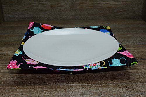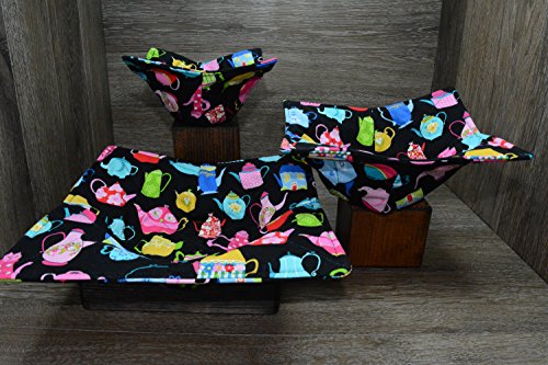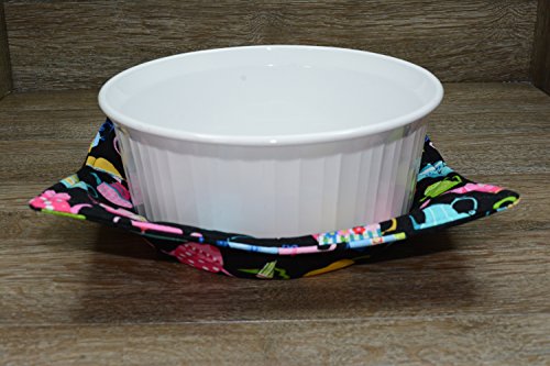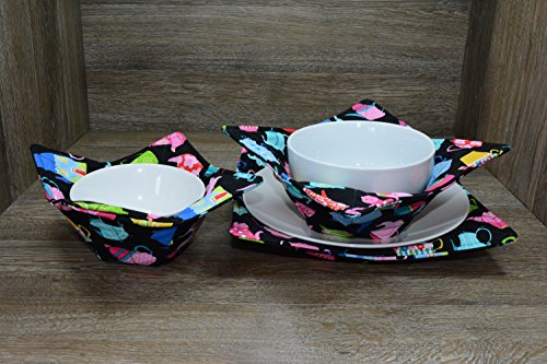 Product Description Microwave cozy set includes 1 small bowl cozy (Approx 6.5" sq), 1 medium bowl cozy (Approx 8" sq), 1 dinner plate cozy (Approx 10" sq.) The dinner plate cozy can also be used for round casserole dishes and the small size is great for coffee mugs! These microwave cozies are the perfect solution to handling super-hot dishes. Cooking and reheating food in a dish cozy makes life so much easier! Place your microwaveable dish inside the bowl cozy and put the whole thing in the microwave to heat. To take the bowl out, you simply grab the corners of the cozy. We found that our kids can now get their dishes out of the microwave safely. Cozies will also protect your fingers from the cold when holding a bowl of ice cream and are great for protecting your table. You can also use a cozy placed on top the dish you are microwaving to help steam food. MATERIALS: * 100% cotton fabric * 2 layers of 100% cotton batting * 100% cotton thread Please be advised: Bowl cozies must only be used in microwaves with a rotating base. To avoid scorching or burning, please make sure cozy freely rotates in your microwave. Never leave microwave unattended. Make sure cozy is clean with no pieces of food attached. Do not microwave cozy for more than three minutes. Cozies can be machine washed on delicate cycle. Reshape and allow to air dry for best results. Please let us know if this is a gift, and we will ship without a packing slip enclosed! #bowlcozy #microwaveable #handmadeatamazon #hot4handmade #buyhandmade 0