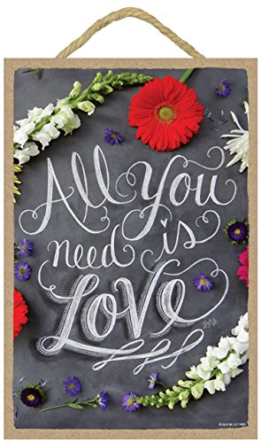 (SJT14803) All you need is love, love is all you need (with colorful flowers) 7" x 10.5" Wood Plaque Sign featuring the chalk artwork of Lily & Val