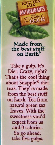 -. Binding : Misc. -. Brand : Snapple -. EAN : 0798527191331 -. Feature : THIS SALE IS FOR SIX BOXES. / BEST BUY DATE IS 03/2015 / made from natural green tea leaves / Iced Tea Mix Antioxidants with Vitamin C and EGCG -. IsAdultProduct : 0 -. Label : Snapple -. Manufacturer : Snapple -. MPN : NA -. PackageQuantity : 1 -. PartNumber : NA -. ProductGroup : Grocery -. ProductTypeName : GROCERY -. Publisher : Snapple -. Studio : Snapple -. Title : Diet Snapple Singles to Go Original Green Tea (6 Sticks in each box) SIX BOXES -. UPC : 798527191331