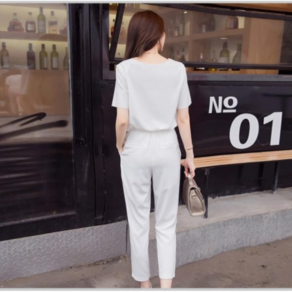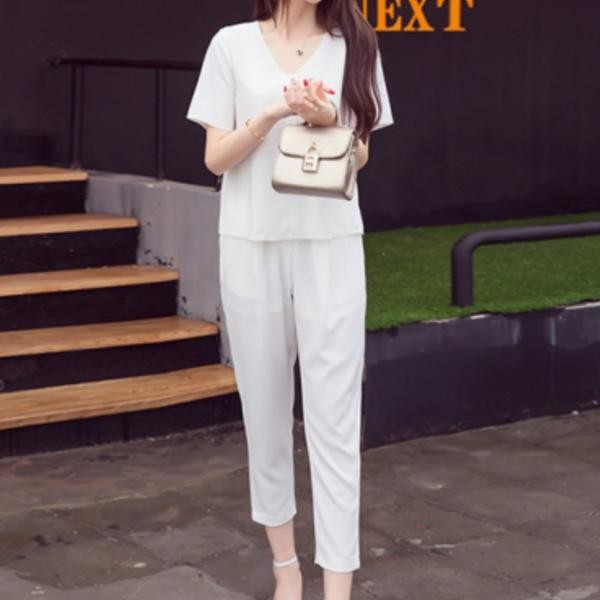 きれいめ☆Vネック 半袖 カジュアルブラウス&シンプル スリム テーパードパンツ セットアップ
