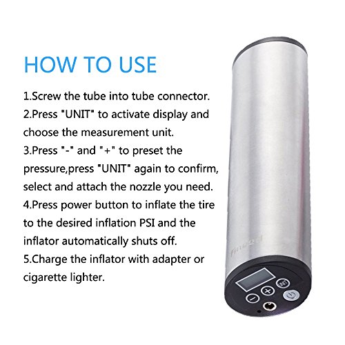 - ●Full range of accesories and excellent service-portable electric air pump,2 air tubes,ac and dc charger,valve adapter,needle,carry bag,user manual and 100% satisfaction MONEY-BACK GUARANTEE!