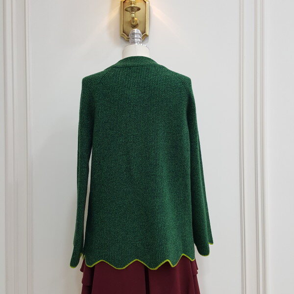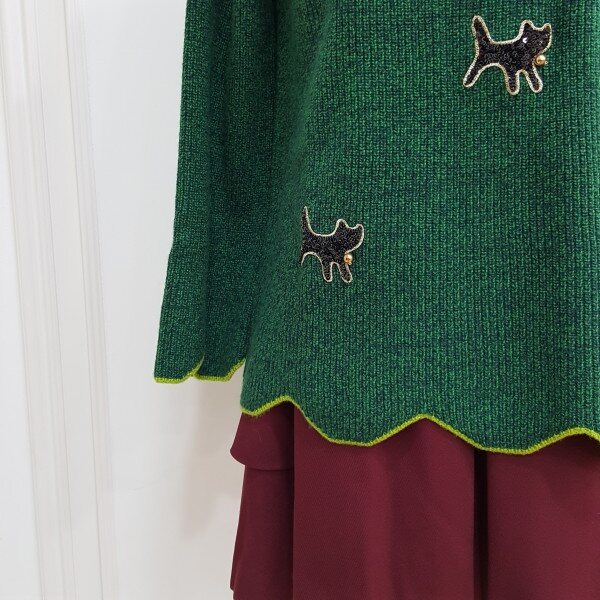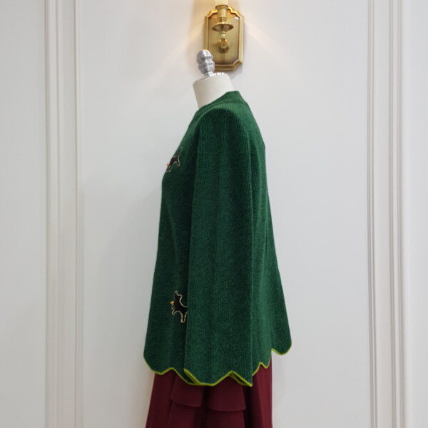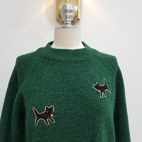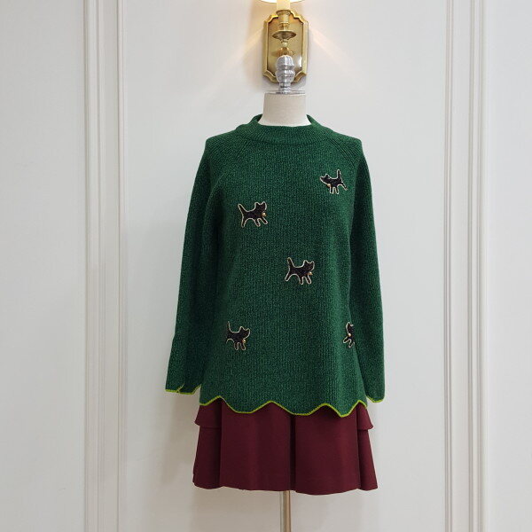 모캐시미어 혼방 트위드 니트탑. 보온성이 좋으며 앞판에 강아지 모양의 장식이 포인트. 밑단을 물결 무늬로 처리하여 캐쥬얼을 강조.