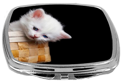 Rikki Knight Compact Mirror, White Kitten In Basket On Black