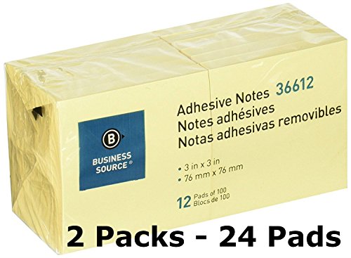 Business Source 3 x 3 Inches Adhesive Notes - Yellow - Pack of 24 - 100 Sheets/Pads - 2 Packs Of 12 Pads