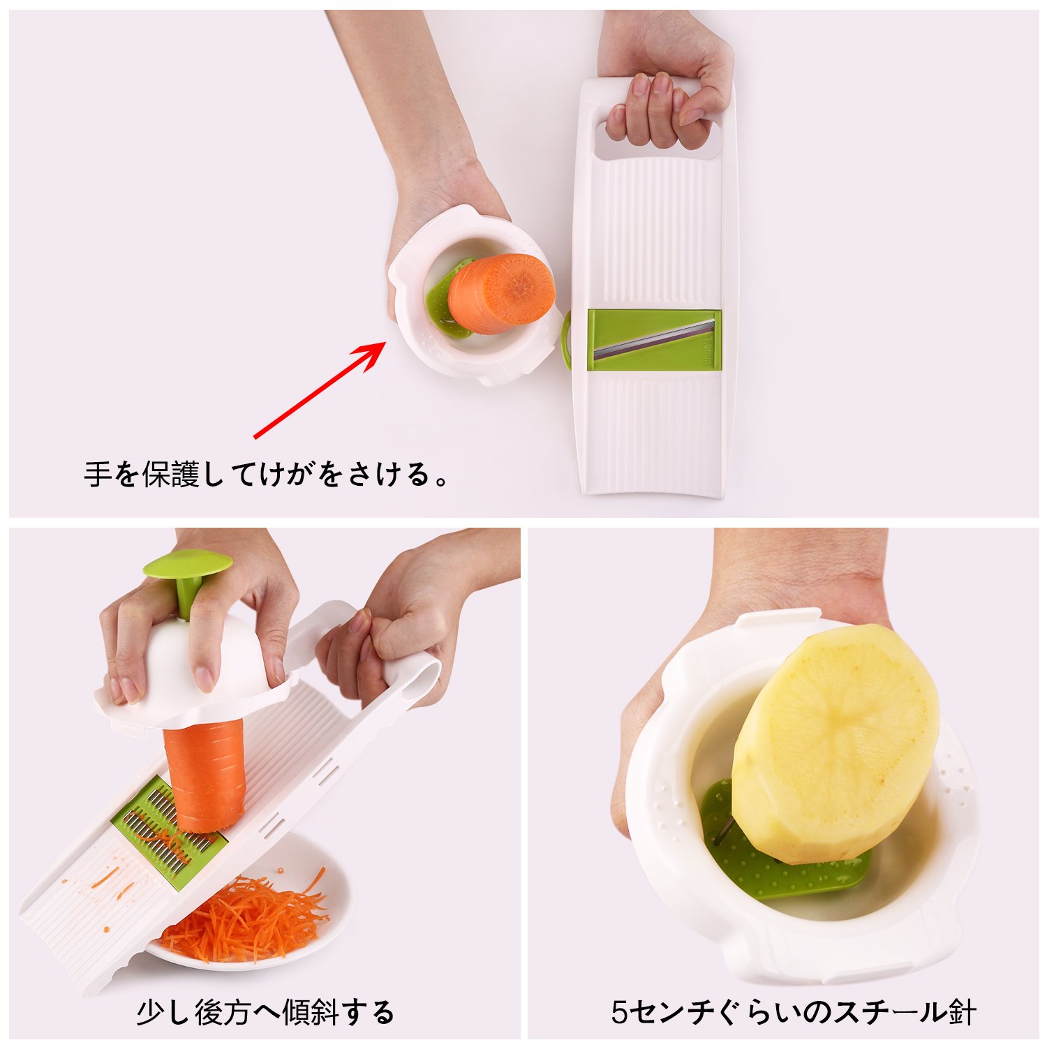 Since safety holder is attached, vegetables can be cut safely without worry of cutting hands
