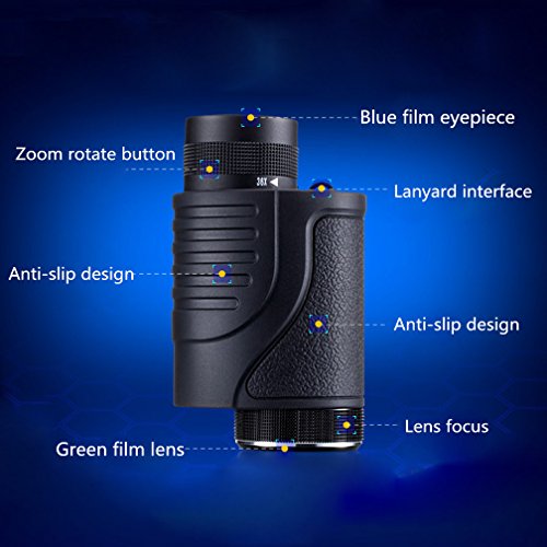 - Feature : Unique metal DV lens design- Cool and show your taste! / 12-36 X 25 Magnification- See things 12X-36X closer and Get Clearer and Brighter range of view with 25mm lens - The most powerful hand held metal stretch zoom monocular available in the market today, Bright, sharp image as close as 13-Inch / Dual Focus-Eyepiece focus & Objective lens focus, make you see farther and more clearly! / UL TRA Clear BAK-4 Prism glass with Multi-layer green broadband coating technology-Make you see the scene more realistic / Compact and Lightweight Portable Design- 6.3oz weight; 4.5 inch length