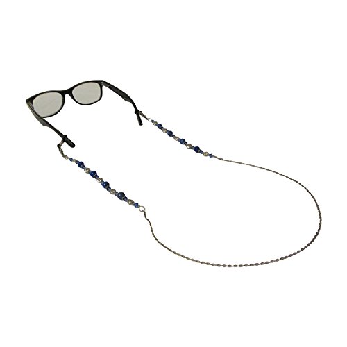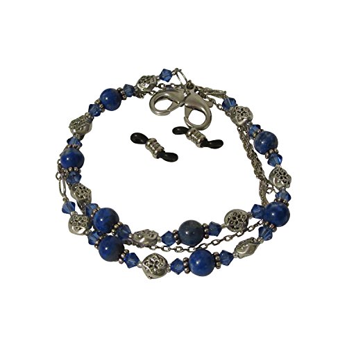 This unique eyeglass holder lanyard necklace is constructed with natural lapis lazuli and crystal beads. Strung from a silvertone link chain this fashionable eyeglass holder necklace is light and easy to wear yet sturdy and durable. Measuring 27 inches from lobster claw to lobster claw this lanyard necklace includes adjustable rubber eyeglass holder findings that will keep your eyeglasses close at hand.