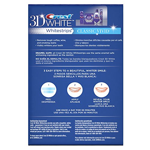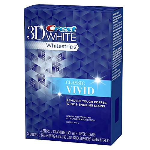 -. Binding : Health and Beauty -. Brand : Crest -. Department : Personal Care -. EAN : 0037000844952 -. Feature : Removes tough coffee, wine, and smoking related teeth stains for a whiter smile / Visibly whiter teeth with full results in 12 days / Apply once a day for 30 minutes / Uses the same enamel-safe teeth whitening ingredients dentists use / A comfortable at home teeth whitening experience -. IsAdultProduct : 0 -. Label : Crest -. LegalDisclaimer : 11 and older -. Manufacturer : Crest -. Model : NA -. MPN : 37000844952 -. NumberOfItems : 1 -. PackageQuantity : 1 -. PartNumber : 37000844952 -. ProductGroup : Beauty -. ProductTypeName : BEAUTY -. Publisher : Crest -. ReleaseDate : 2014-02-17 -. Size : 24 Pack -. Studio : Crest -. Title : Crest 3d White Vivid Teeth Whitening Strips 12 Count -. UPC : 037000881759 -. Warranty : Satisfaction Guaranteed. If you are not satisfied with your results, Crest will refund your purchase P.R.Ice. Simply return your receipt and package UPC within 60 days of purchase. Limit to one refund per person. Call 1-800-208-0169 for more information.