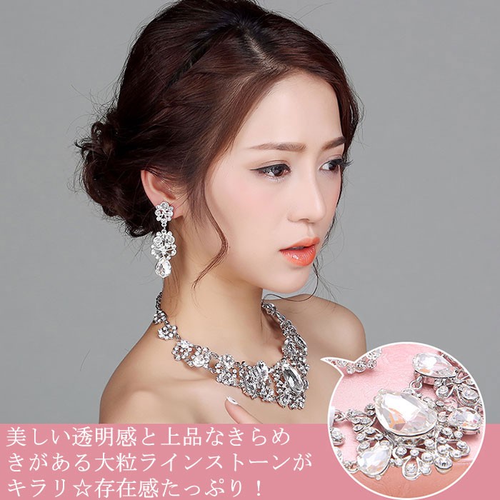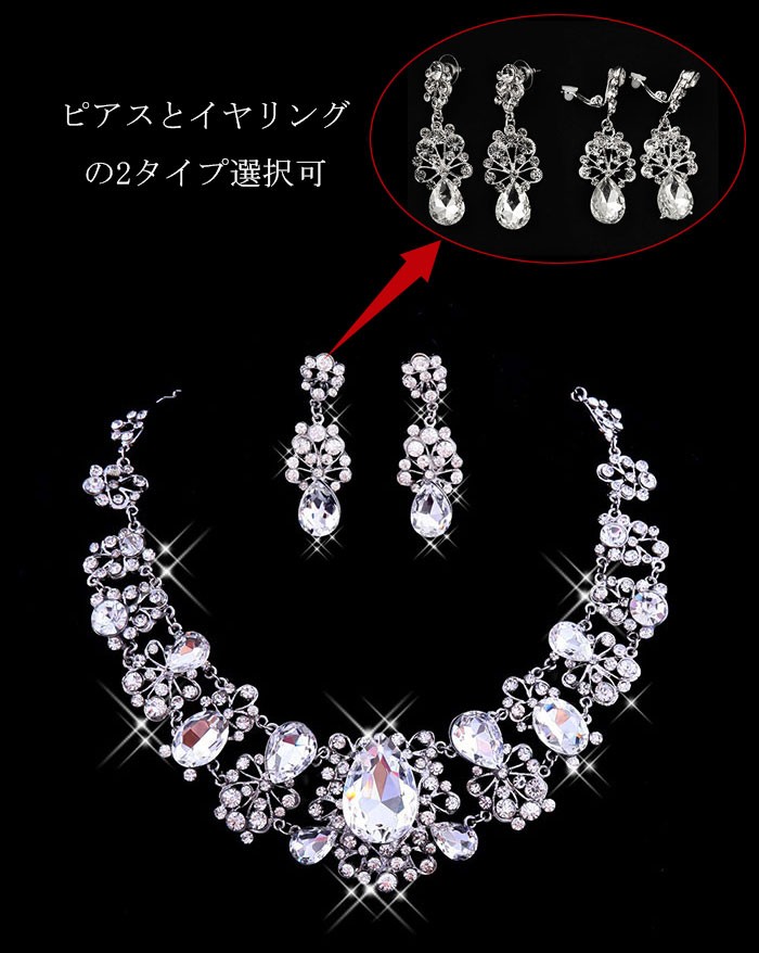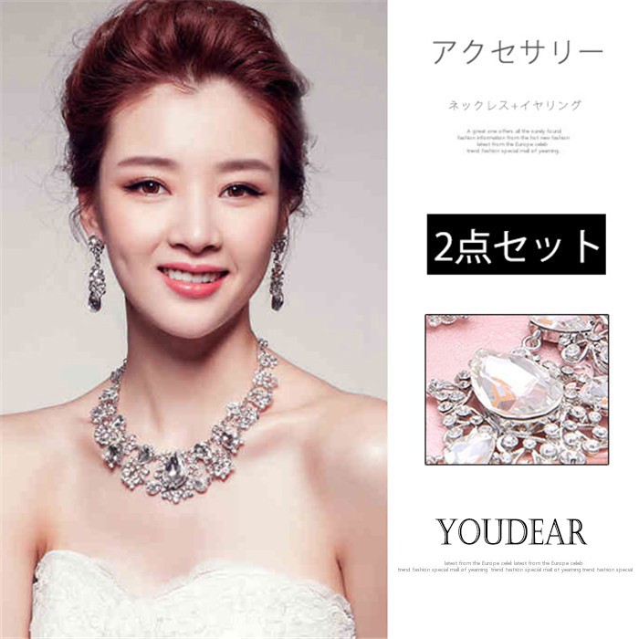 ★ご注意:こちらの商品はお客様がご入金後、メーカーから取り寄せさせて発送する予定です。ご入金からお届けまで約5-7営業日ほど時間がかかります。予めご理解いただきました上でご注文下さいますようお願いいたします。ウェディングの披露宴や二次会ではもちろんの事、 パーティーやイベント等のドレスや衣装にもピッタリです。 今年の誕生日プレゼントやギフトとして、大人気があるヒット商品です。つけるだけでオシャレ上級者に見られちゃう…! さっとコーディネートにプラスするだけで、ぐっとお洒落になるアクセサリセット!★内容:ネックレス+イヤリング/ピアス 2点セット★カラー:写真参考※お客様ご使用のPC環境により商品画像のカラーが多少異なる場合があります。仕入時期により多少デザインなど異なる場合があります。ご了承ください。★サイズ:ネックレス:(長さ)48-62cm(高さ)4cm/イヤリング/ピアス:6*2 cm