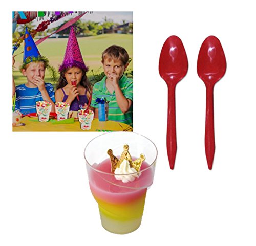 PACK INCLUDES: 98 piece ice cream set. Includes 48 7 oz high quality clear plastic swirled ice cream dessert cups with 50 vibrant red plastic spoons. The cup measures 2.75" tall, 2.75" wide at top, 2.50" at bottom.