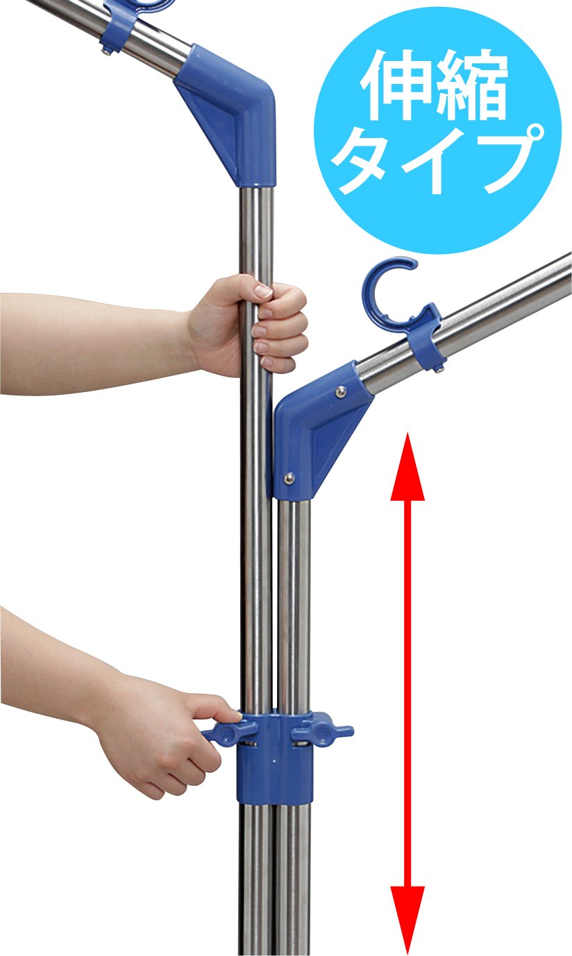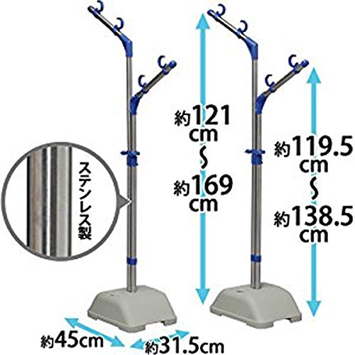 商品サイズ(cm):幅約80×奥行約31.5×高さ約119.5~169 重量(kg):約2.68kg(1台あたり) 材質:ステンレス巻きスチールパイプ、ポリプロピレン、ABS樹脂、ポリエチレン 干す量の目安:約5人分(シャツ等20枚、バスタオル6枚、タオル5枚、小物24枚) 耐荷重:土台重量1つあたり14kg以上(水使用)時:全体24kg、竿1本あたり6kg