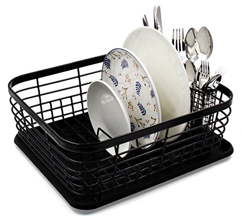 ESYLIFE Kitchen Dish Drainer Drying Rack with Drip Tray and Full-Mesh Silverware Storage Basket, Black