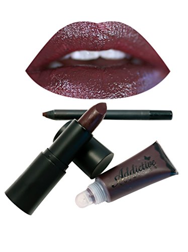 Dark Red Lipstick, Lipliner and Lip Gloss Set by Addictive Cosmetics- All Natural Organic Lipstick, Liner and Lip Gloss- Vegan Friendly and Cruelty Free Cosmetics- Made in the USA- RAISIN THE ROOF