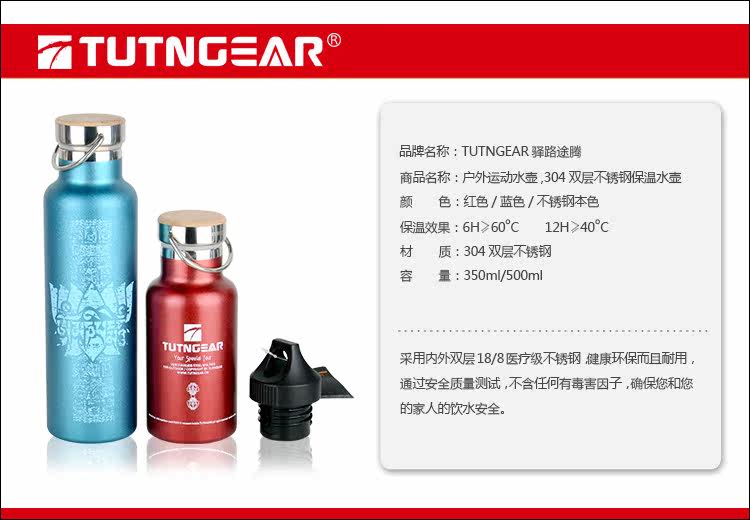 -TUTNGEAR?stainless steel vacuum thermos?bottle?has the advantages of high efficiency?heat preservation?/?cooling function,?through the actual test?A:?when the environment temperature is 28?degrees Celsius,?the temperature?from 95?degrees Celsius?to 42 degrees Celsius,?the average?holding time is 16?hours.?B:?when the environment temperature is?-2?degrees Celsius?condition,?water temperature?from 96?degrees Celsius?to 30 degrees Celsius?on average?for 16 hours.?(Note:?the normal human?oral?temperature is 36.3?degrees -37.2 degrees)