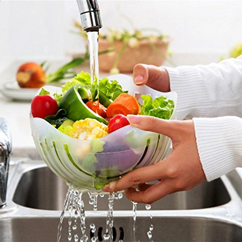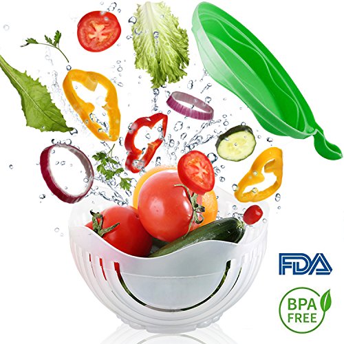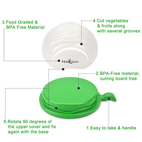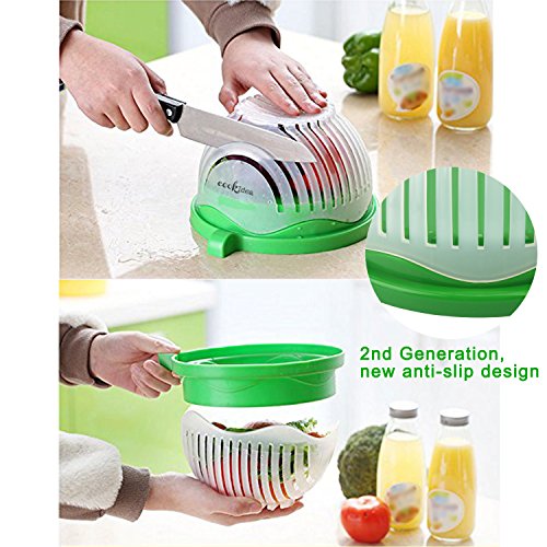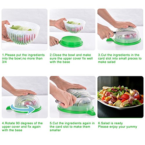 How to Use? Step 1:Put all ingredients into salad chopper and wash to clean,please do not put too much, no more than three quarters should be great; Step 2:Make sure the upper cover Lock the base compeletly; Step 3:Cut the ingredients in the card slot into small pieces; Step 4: Then rotate 90 degrees of the upper cover and fix again with the base,you can cut the ingredients again in the card slot to make them smaller if you like; Step 5: Enjoy your fresh, delicious and healthy salad. Attention: Do not put too much ingredients,no more than 3/4 is perfect; Do not lock the ingredients,do not have gap and to make sure the cover fully fit; Please turn the bowl only,do not turn together with the food; Knife should be about 7 inches. Customer Service and Warranty GET IT RISK-FREE: Buy with peace of mind, knowing that this Salad Cutter Bowl is backed by a hassle-free, 2 years money back guarantee of complete satisfaction! 0