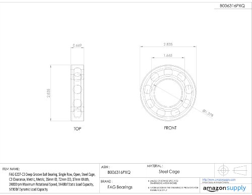 FAG 6207-C3 Deep Groove Ball Bearing, Single Row, Open, Steel Cage, C3 Clearance, Metric, 35mm ID, 72mm OD, 17mm Width, 24000rpm Maximum Rotational Speed, 3440lbf Static Load Capacity, 5730lbf Dynamic Load Capacity