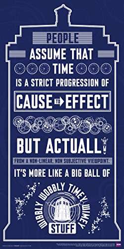 This poster features an illustration of the TARDIS from the classic BBC television series Doctor Who, and includes the quote "People assume that time is a strict progression of cause to effect but actually from a non-linear, non subjective viewpoint, it's more like a big ball of wibbly wobbly timey wimey stuff.".