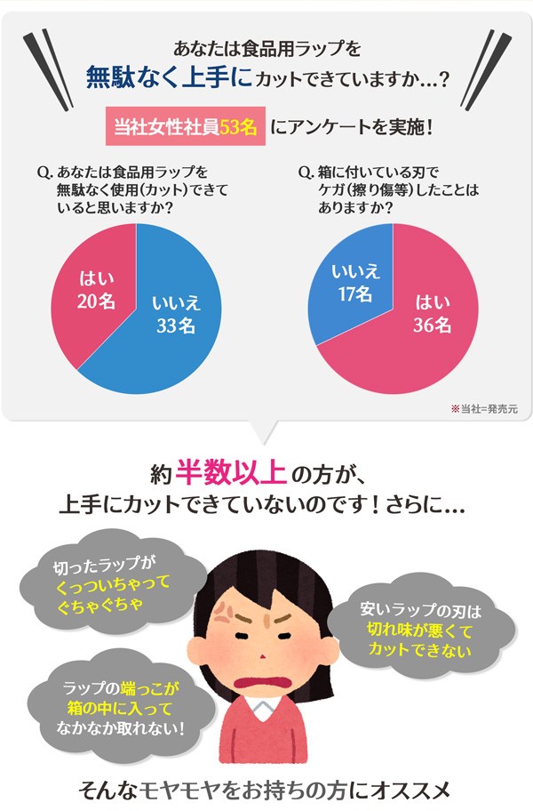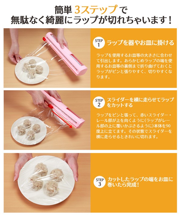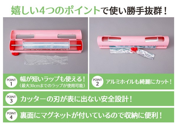 | 食品用ラップを無駄なく、失敗なく、そして素早くカット!スライダーを移動させるだけでサッとラップが切れます。このケース1つで幅の違うラップを収納可能!カッターの刃が表に出ない安全設計。アルミホイルもカットできます。裏面にはマグネット付き。 |