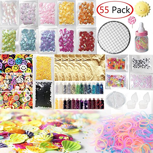 Slime Supplies Kit, 55 Pcs Slime Kit for Girl, Eyes, Shell, Snowflake, Slices, Rubber Band, Lollipops, Glitter Jars, Imitation Gold Leaf for Slime DIY Craft, Homemade Slime, Slime Party Decoration