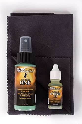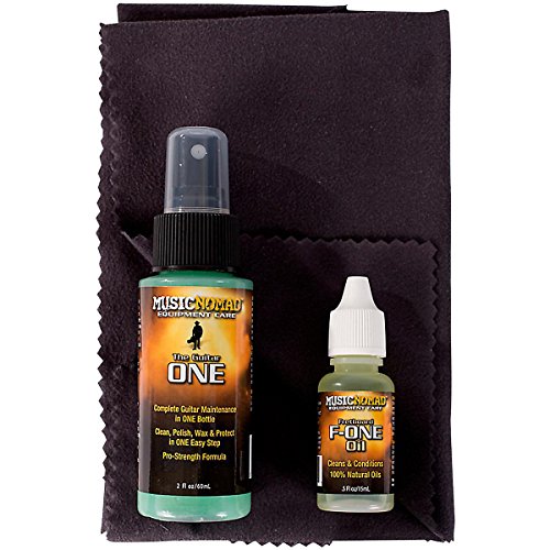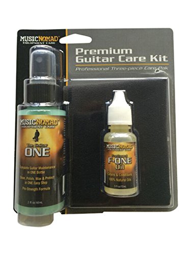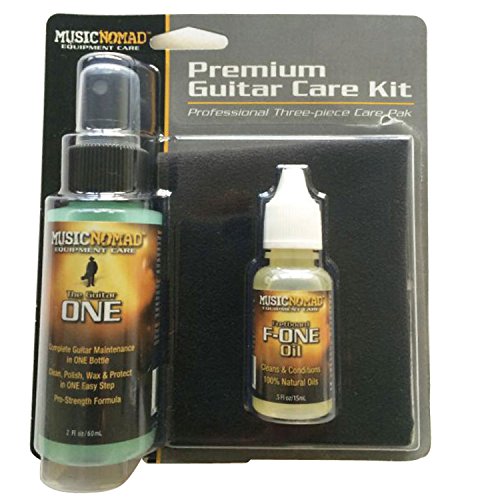 Studio : Music Nomad Equipment Care Publisher : Music Nomad Equipment Care Binding : Electronics Product Description Music Nomad's Professional Grade Three-piece Care Kit contains one each of their most popular items to care for stringed instruments. The Guitar ONE (2oz/60ml) is an All-in-1 cleaner, polish and wax for everyday cleaning and polishing gloss finishes in ONE easy step. Great for the body, back of neck and finished fret boards. The streak free, organically formulated proprietary formula has UV protectants, gloss enhancers and even smells amazing. The 100% Natural Fret board F-ONE (1/2 oz./15ml) Oil helps clean, condition, restore and protect your unfinished Rosewood, Ebony, or Maple fret board and contains no lemon oil, petroleum, wax or water. Plus a large 12" x 12" premium suede microfiber cloth to be used with these products or by itself to clean fingerprints, sweat, dust and grime. Music Nomad products are used worldwide by: Musicians, Repair Shops, Guitar Techs, Instrument Makers, Luthiers and Collectors. 0
