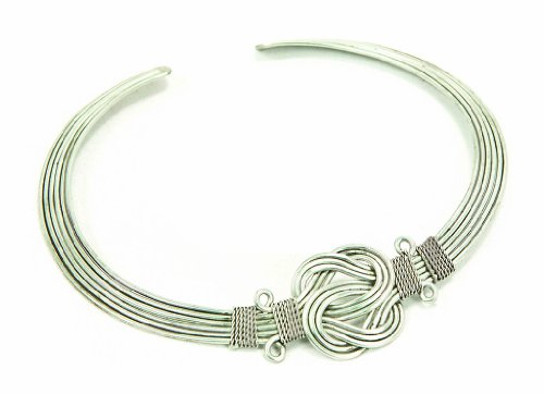 This unique silver-plated brass necklace features a Buddha's knot at the center, accented with loops and "braid" on each side. It is very malleable and easy to fit. Adjustable. Made by several families in the heart of Delhi, crafting their jewelry with pride. This traditional artform has been passed down to the artisans through generations of crafts people.