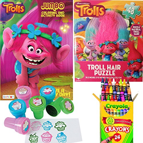 - This set includes one Coloring Book (96 pages, Cover may vary) , Trolls Puzzle (48 pieces), 24 Crayola Crayons and 6 Cupcake Stampers