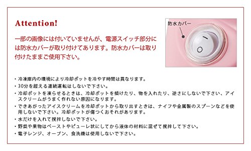【주의】일부의 화상에는 붙어 있지 않습니다만,전원 스위치 부분에는 방수 커버가 장치해 있습니다.방수 커버는 장치한 채로 사용해 주십시오.사용전에 14~16시간 냉각 포트를 냉동고에 식혀 주십시오.냉동고내의 환경에 의해 냉각 포트를 식히는 시간은 다릅니다.냉각 포트를 식힐 때는,JIS규격으로 정할 수 있던 냉동고 기호가 쓰리 스타 이상의 냉동고를 사용하고, 온도 설정은-18℃이하로 주십시오.30분을 초월하는 연속 운전은 하지 말아 주십시오.완성된 아이스크림을 냉각 포트부터 꺼낼 때는,나이프나 금속제의 스푼 등을 사용하지 말아 주십시오.냉각 포트가 흠날 우려가 있습니다.야채나 과일은 Paste나 퓌레 모양으로 하고 나서 액체의 재료에 혼합해 교반 해 주십시오.수만(만큼,수록)을 넣고 교반 하지 말아 주십시오.