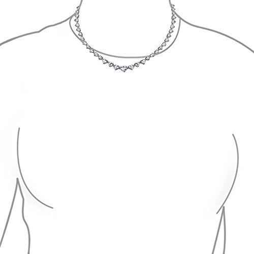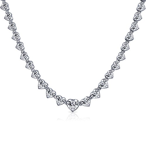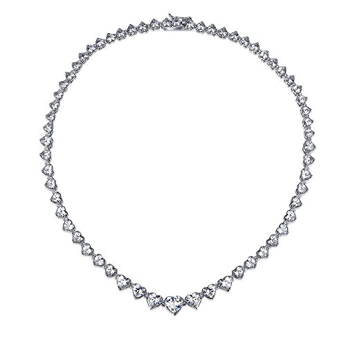 This rhodium plated brass tennis necklace is lined with heart shaped Cubic Zirconia stones. A tongue snap clasp and safety wing help to securely fasten it around your neck. This versatile heart necklace is a perfect match for your tennis bracelet. It also makes a sensational gift for brides, bridal parties, Christmas, Valentines Day or simply for that special someone.