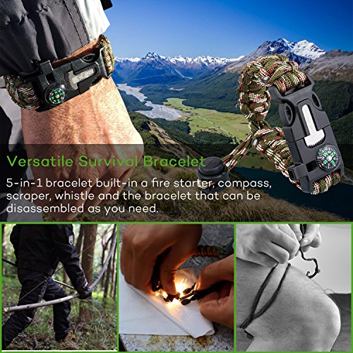- Bonus Survival Bracelet: 5-in-1 paracord bracelet features a fire starter, compass, scraper, whistle and the bracelet that can be disassembled into 2.5 meters survival rope with a tested tensile strength of up to 200 kg. You can adjust the bracelet to your waist so it’s not easy to lose. Ideal for outdoor activities, adventures, emergencies!