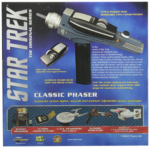 -. Feature : Most iconic props in science fiction history / Classic replica recreates star trek Phaser in every detail / Features a removable type 1 phaser complete with light-up and sound effects / Also features multiple settings for the authentic Star Trek experience / Includes authentic action lights and sounds and adjustable power settings