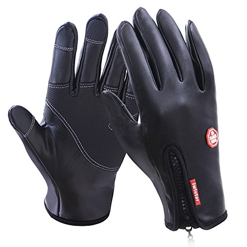 -. Feature : Woks with Touchscreens and Smartphones: You can use your smartphone without taking them off because of conductive metal fibers, except for middle finger and palm / High-quality Raw Materials: The gloves make of leather and use the newest water-resistant and windproof materials, and work well even if in the rain or extreme environments. (Please note: this item is water-resistant, not water-proof; it is not designed for use underwater or in very heavy rain. Cannot be completely soaked in water.) / Anti-skid design: The palm of gloves using convex lattice design with non-slip effect, wear-resistant silicone that helps grip the bicycle¡¯s handlebars even on rough and bumpy roads / Adjustable Size: Gloves feature a zipper on the back so wearers can adjust the size to suit their unique hands / Warm Design: Use these gloves to keep warm in winter and to make your cycling more comfortable! They can also be perfect for a variety of occasions, such as walking the dog, running, driving, etc.