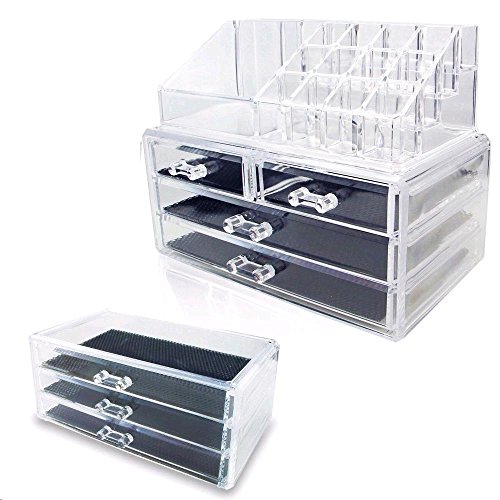 This convenient 3 Stackable Organizer makeup jewelry and accessory acrylic stackable organizer saves desk and table space and is perfect for beauty products from makeup brushes to compact powders and foundation. The different compartments and drawers help keep your makeup and accessories tidy and easy to access. Features: 100% Premium Crystal Clear Acrylic organizer by Ikee Design For organizing your makeup, cosmetic and jewelry accessories Beautiful and Classy when placed on a vanity Stackable and Durable Specification: - Color: Crystal ClearThe set dimension: 9 3/8"W x 5 3/8"D x 7 1/4"H and 9 3/8" x 5 3/8" x 4 3/8"H . Accessories not included.
