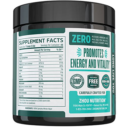 MORE NUTRITIOUS THAN CHLORELLA – This blue green algae contains the highest concentration of protein of any plant, herb or animal on a gram per gram basis. It contains 15x more beta-carotene than carrots, 1.5x more calcium than milk and more iron than spinach. It also contains more essential amino acids, iron, protein, B vitamins, and vitamins C, D and E than chlorella. Just 2 servings a day equals 7+ servings of common fruits and vegetables in terms of antioxidant content.