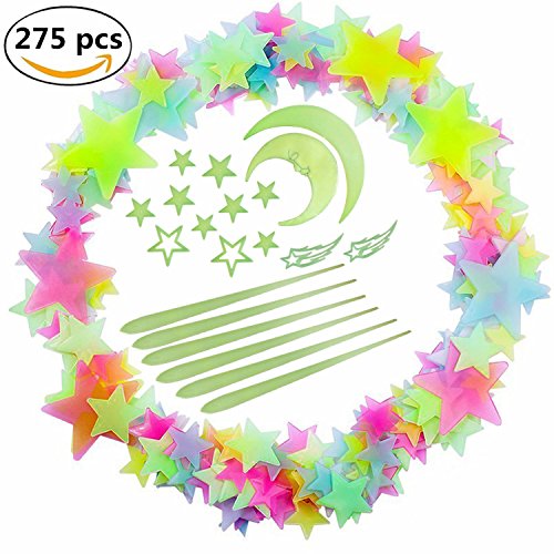 - ✔ KINDS OF SHAPE: Total: 275x Three-Dimensional Wall Stickers (meteor, star, moon) 15 x meteor; 50 x Green star(L); 100 x Green star(S) ;100 x Colour strar; 10 x mix (Crescent moon, star, cloud).
